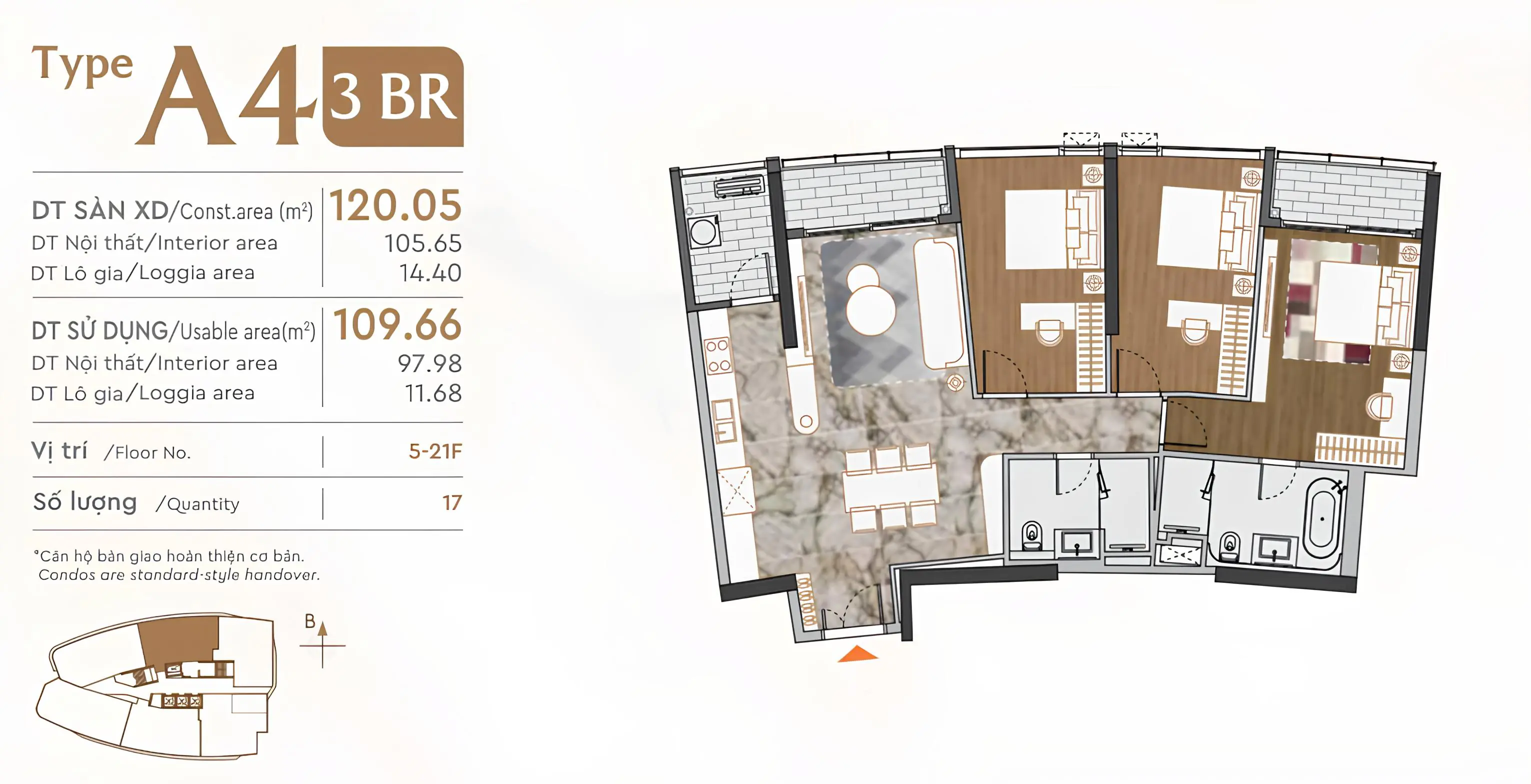 • Kết cấu: 3 Phòng ngủ, 3 WC, 3 ban công