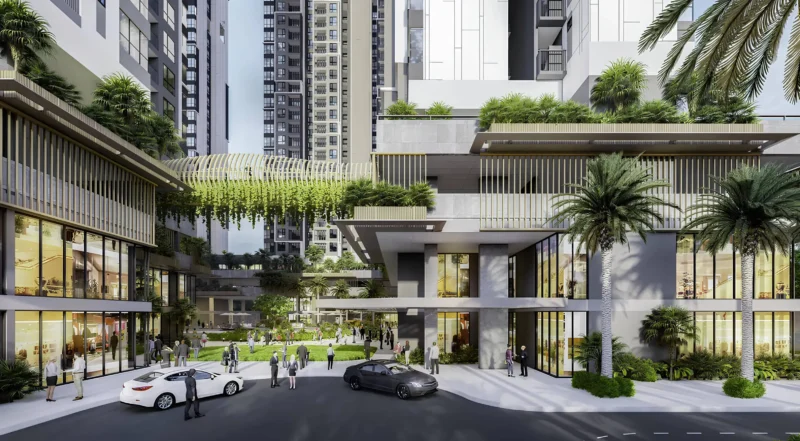 Phân tích sâu: Thiết kế hiện đại, sang trọng với ban công rộng, hành lang thoáng và vật liệu cao cấp, đảm bảo tầm nhìn panorama ra sông và thành phố. Lợi ích là sự linh hoạt cho cả ở thực (gia đình trẻ) và kinh doanh (shophouse mặt tiền đường lớn), đồng thời ưu tiên bền vững môi trường qua hệ thống cây xanh dày đặc. Điều này không chỉ nâng tầm thẩm mỹ mà còn cải thiện chất lượng không khí, giảm stress đô thị – một điểm mạnh so với các dự án đông đúc khác tại Bình Dương.
