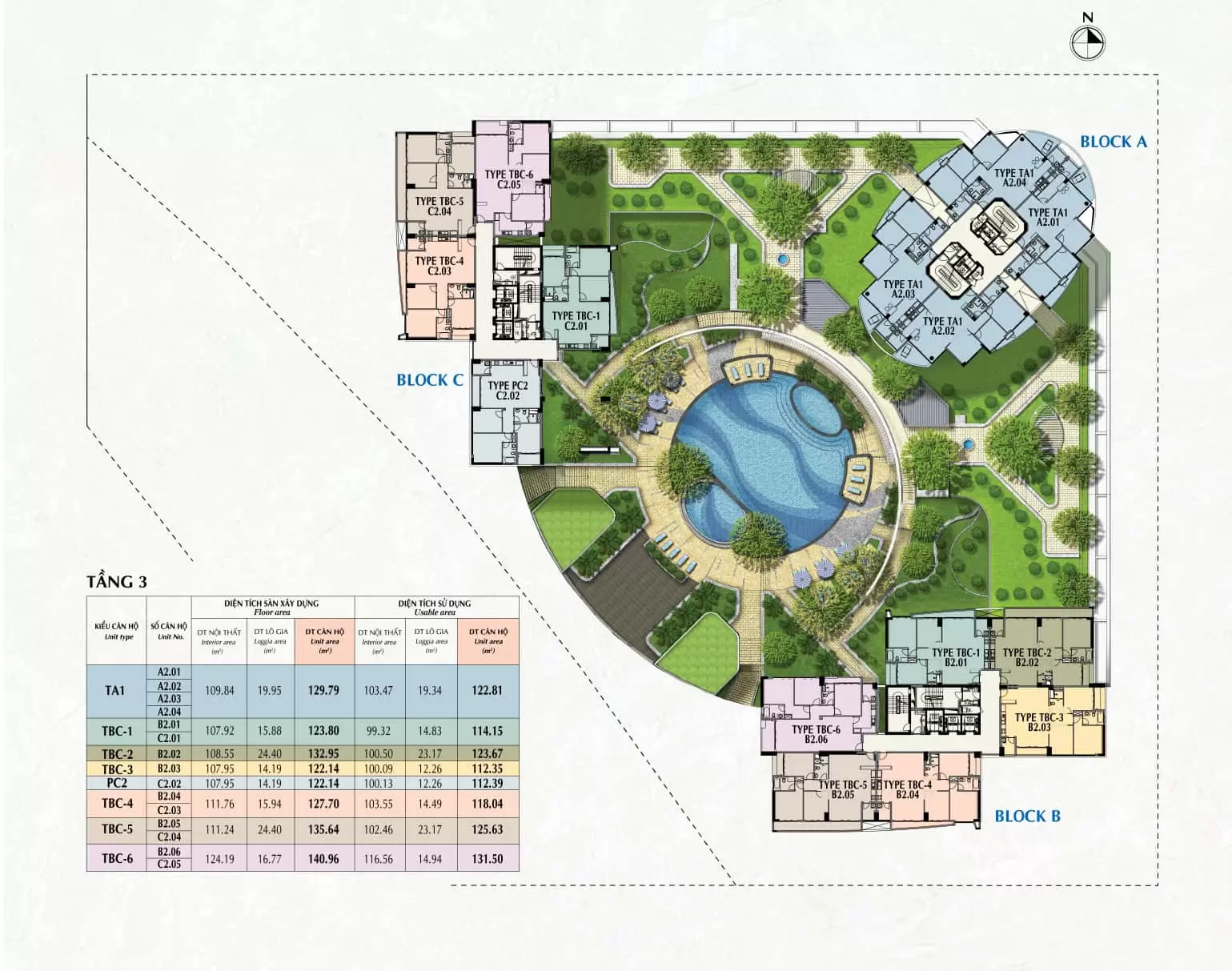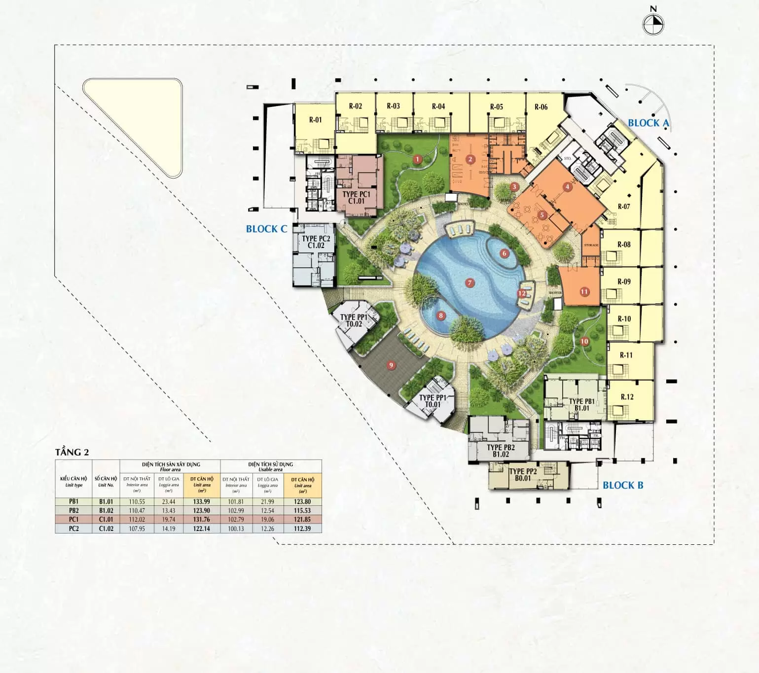 - Tầng 2: Khu vực tiện ích cộng đồng như hồ bơi, phòng gym, sân chơi trẻ em.