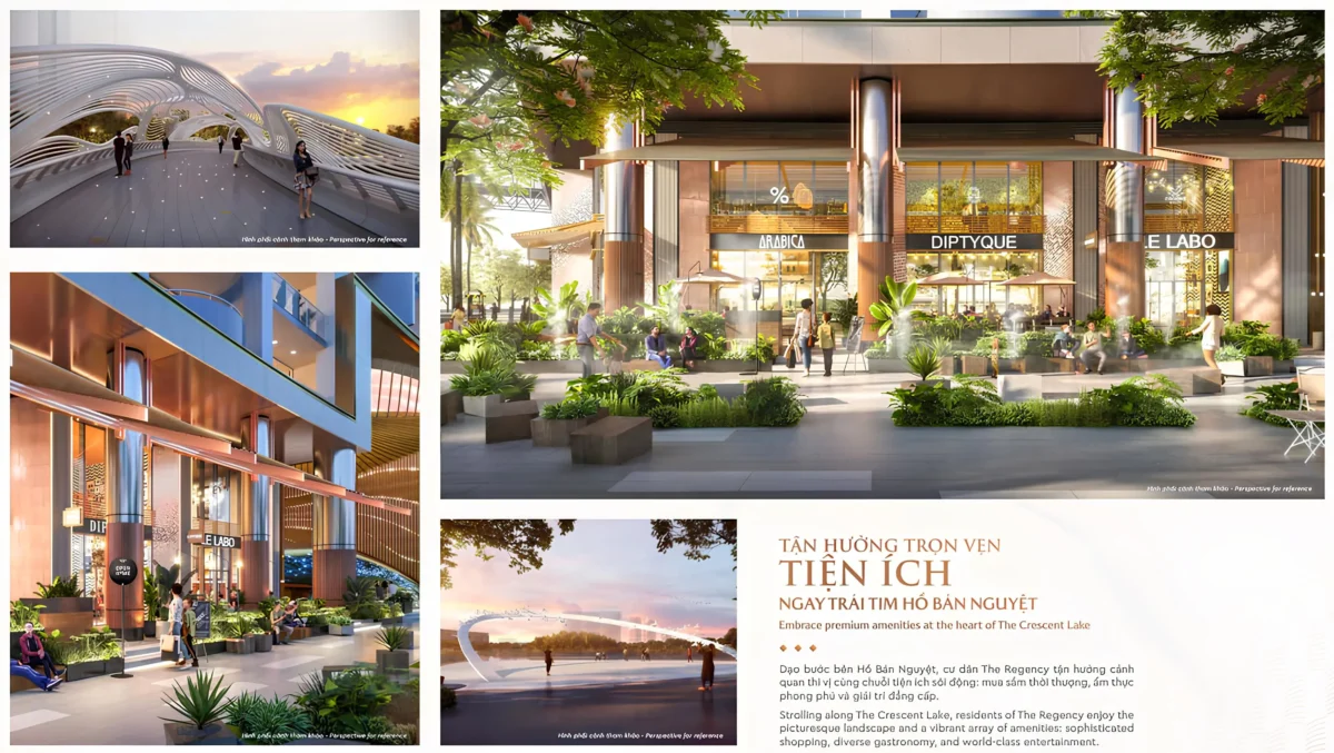 The Regency thừa hưởng hệ sinh thái ngoại khu đẳng cấp: 50m đến Hồ Bán Nguyệt & Cầu Ánh Sao, 700m đến Crescent Mall (thương hiệu xa xỉ, F&B cao cấp), 500m đến SECC và CBD tài chính.
