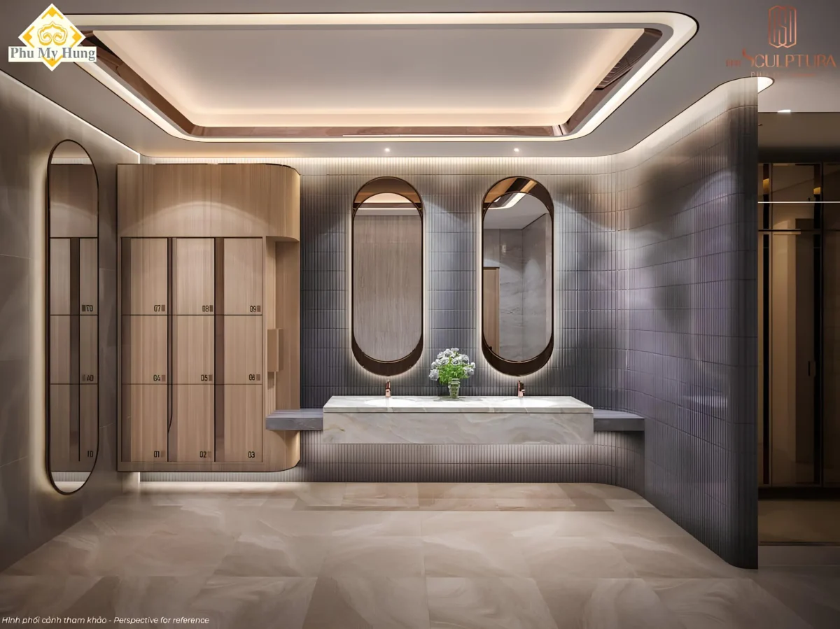 Sảnh đón tiếp: Được thiết kế như một tác phẩm nghệ thuật với các đường nét điêu khắc mềm mại, mang đến trải nghiệm thượng lưu ngay từ lối vào.