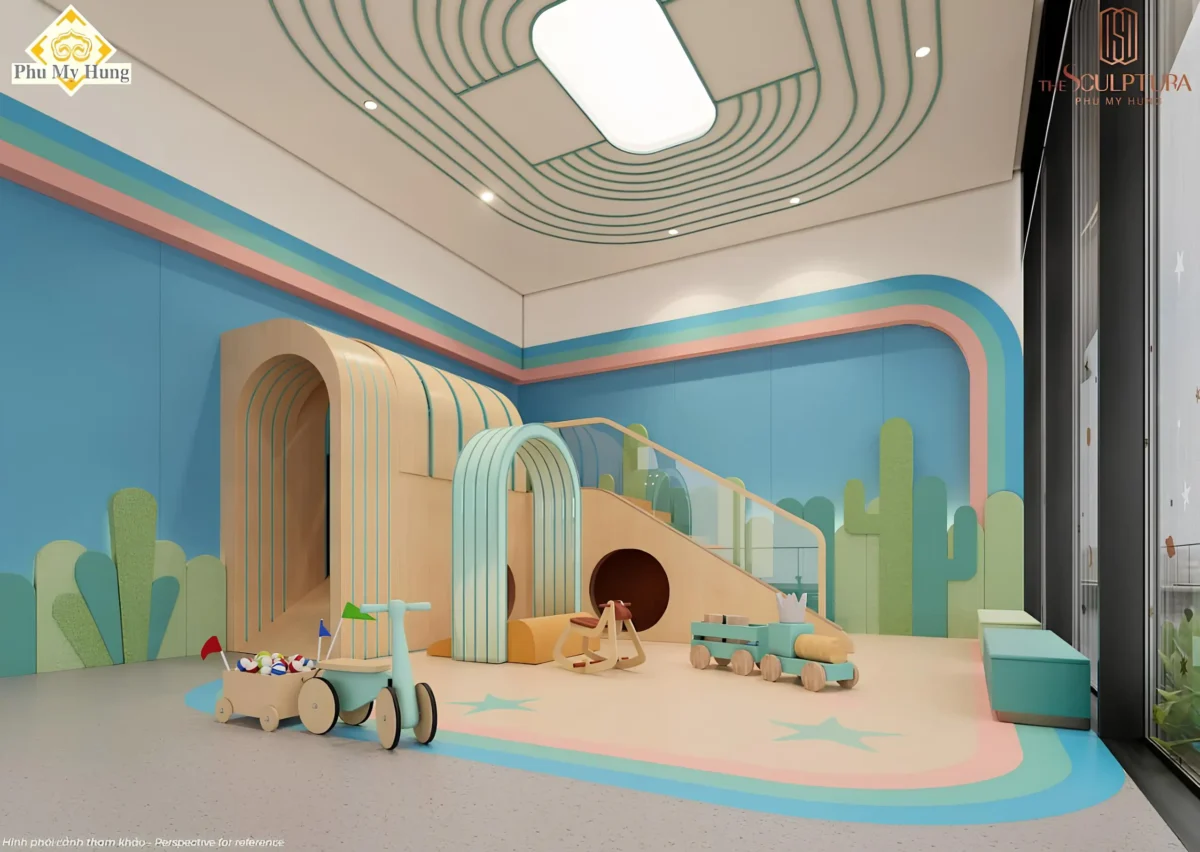 Khu vui chơi trẻ em: Không gian trong nhà và ngoài trời được thiết kế an toàn, khuyến khích sự sáng tạo.