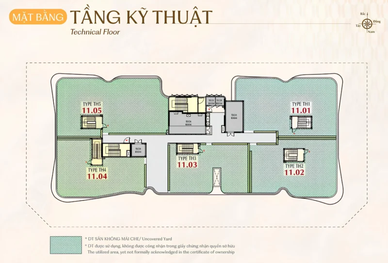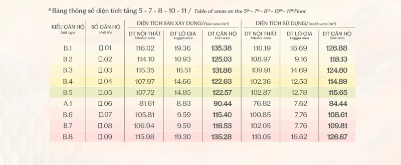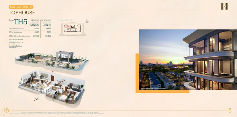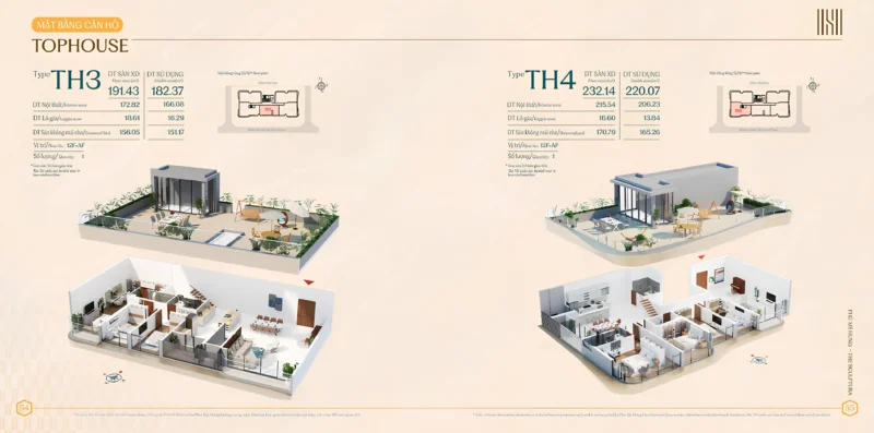 - Tầng 12: 5 căn penthouse duplex với vườn riêng từ 151m² đến 252m², tổng diện tích lên đến 333m² – 477m², mang phong cách “biệt thự trên không”.