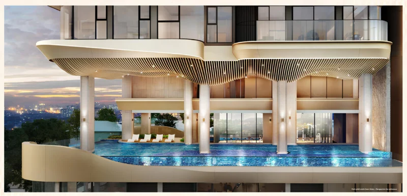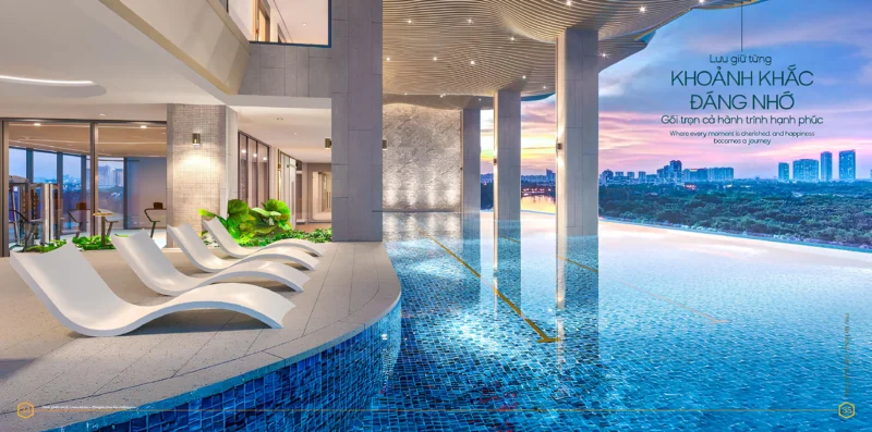 - Hồ bơi dài 25m: Thiết kế hồ bơi tràn bờ hướng ra công viên Ánh Trăng, với trần cao thoáng đãng, mang đến không gian thư giãn tuyệt đối và tầm nhìn xanh mát, lý tưởng cho việc bơi lội và nghỉ ngơi.